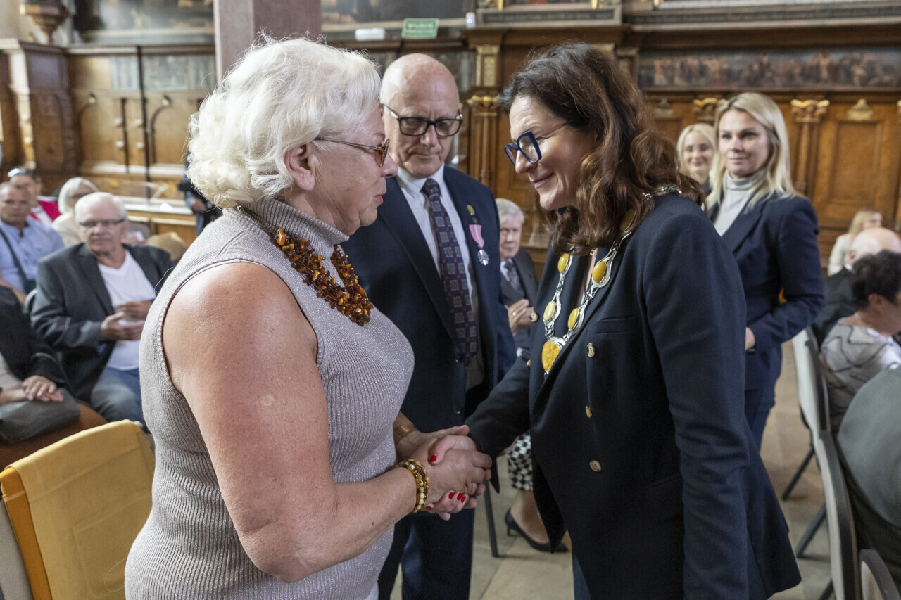 Gdańsk.Dwór Artusa. Jubileusz Par Małżeńskich - Złote Gody, podczas których Prezydent Gdańska Aleksandra Dulkiewicz wręczyła medale za długoletnie pożycie małżeńskie.