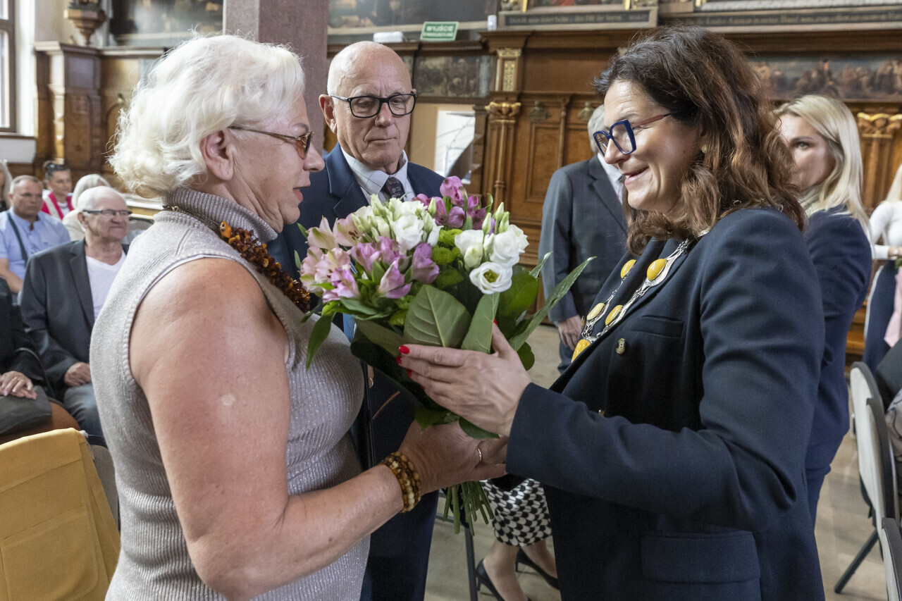 Gdańsk.Dwór Artusa. Jubileusz Par Małżeńskich - Złote Gody, podczas których Prezydent Gdańska Aleksandra Dulkiewicz wręczyła medale za długoletnie pożycie małżeńskie.