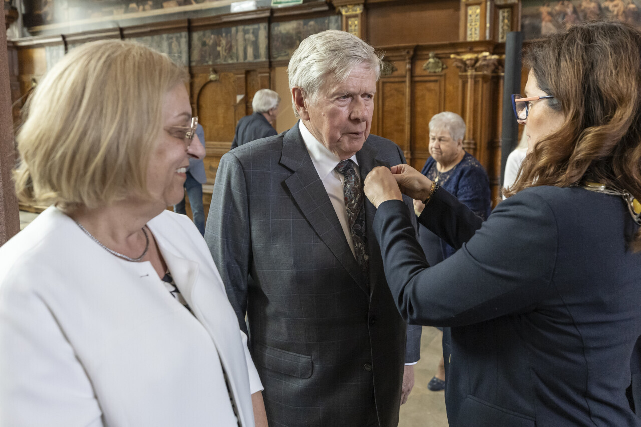 Gdańsk.Dwór Artusa. Jubileusz Par Małżeńskich - Złote Gody, podczas których Prezydent Gdańska Aleksandra Dulkiewicz wręczyła medale za długoletnie pożycie małżeńskie.