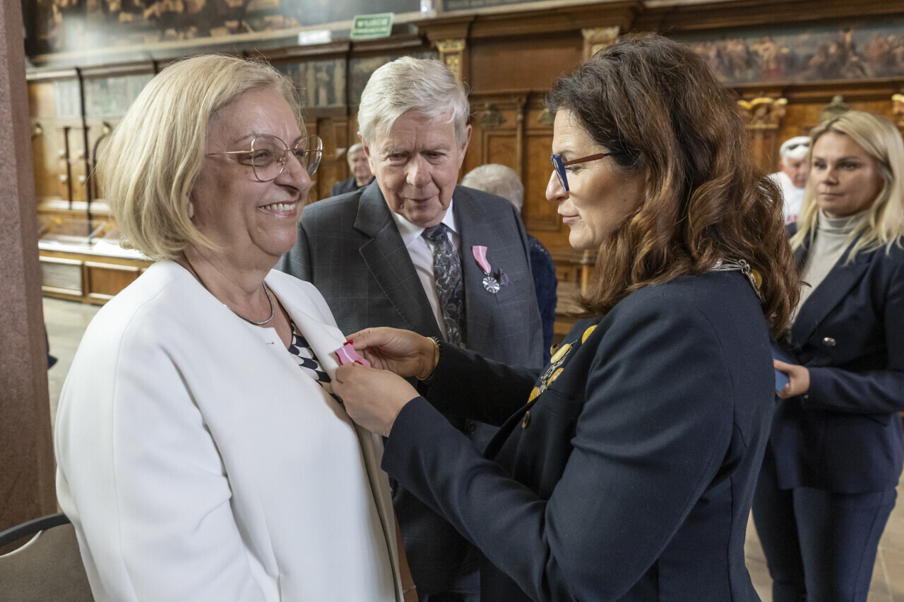 Gdańsk.Dwór Artusa. Jubileusz Par Małżeńskich - Złote Gody, podczas których Prezydent Gdańska Aleksandra Dulkiewicz wręczyła medale za długoletnie pożycie małżeńskie.