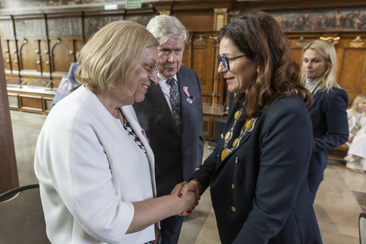 Gdańsk.Dwór Artusa. Jubileusz Par Małżeńskich - Złote Gody, podczas których Prezydent Gdańska Aleksandra Dulkiewicz wręczyła medale za długoletnie pożycie małżeńskie.