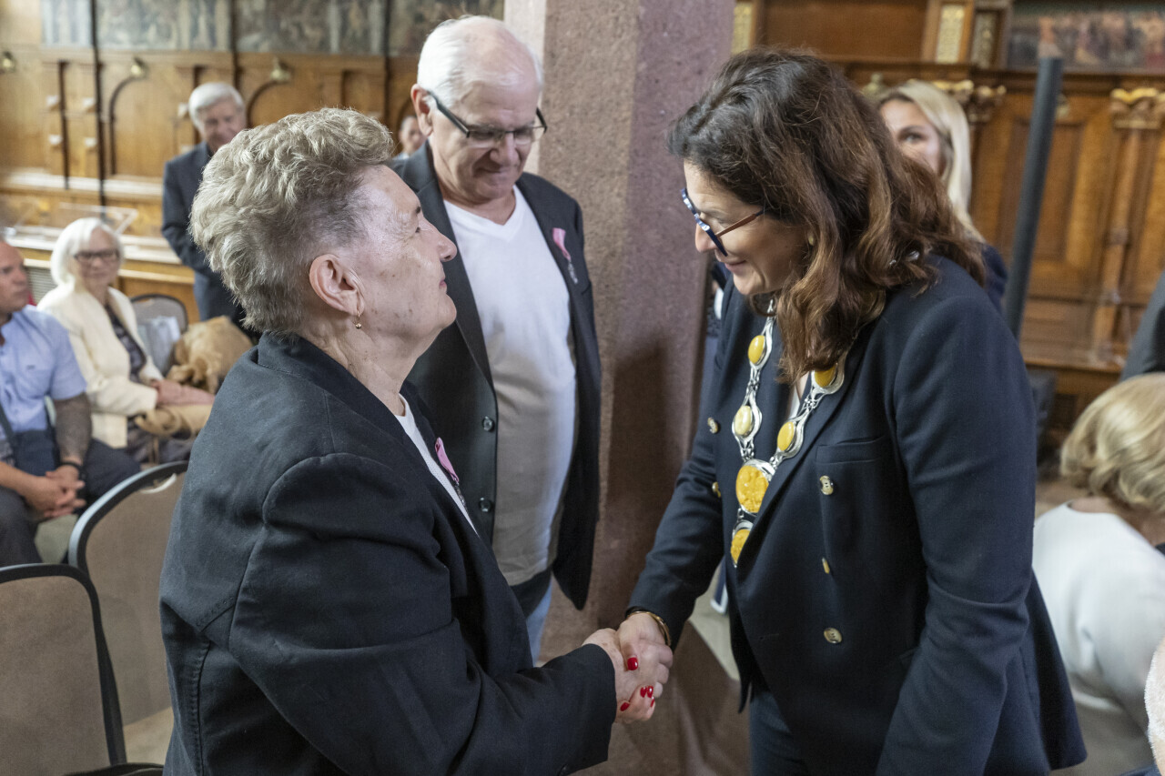 Gdańsk.Dwór Artusa. Jubileusz Par Małżeńskich - Złote Gody, podczas których Prezydent Gdańska Aleksandra Dulkiewicz wręczyła medale za długoletnie pożycie małżeńskie.