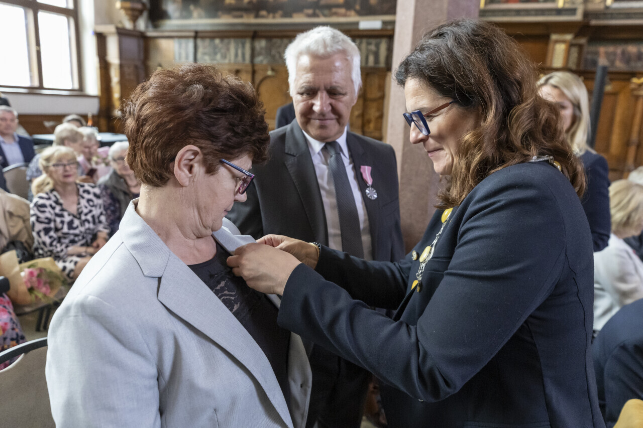Gdańsk.Dwór Artusa. Jubileusz Par Małżeńskich - Złote Gody, podczas których Prezydent Gdańska Aleksandra Dulkiewicz wręczyła medale za długoletnie pożycie małżeńskie.