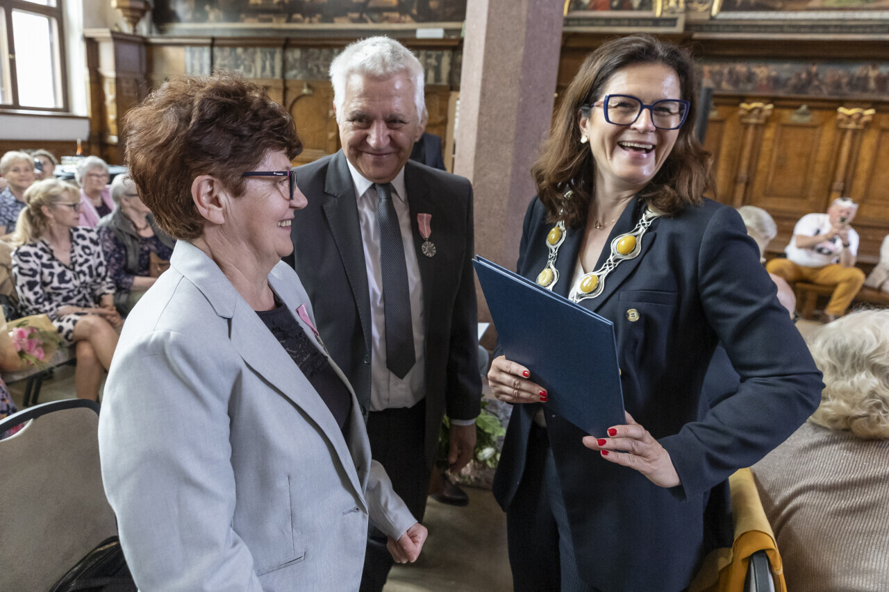 Gdańsk.Dwór Artusa. Jubileusz Par Małżeńskich - Złote Gody, podczas których Prezydent Gdańska Aleksandra Dulkiewicz wręczyła medale za długoletnie pożycie małżeńskie.