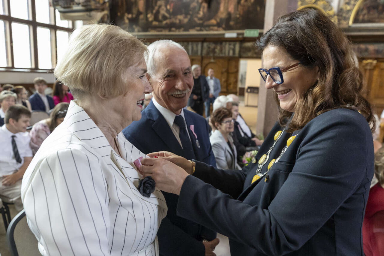 Gdańsk.Dwór Artusa. Jubileusz Par Małżeńskich - Złote Gody, podczas których Prezydent Gdańska Aleksandra Dulkiewicz wręczyła medale za długoletnie pożycie małżeńskie.
