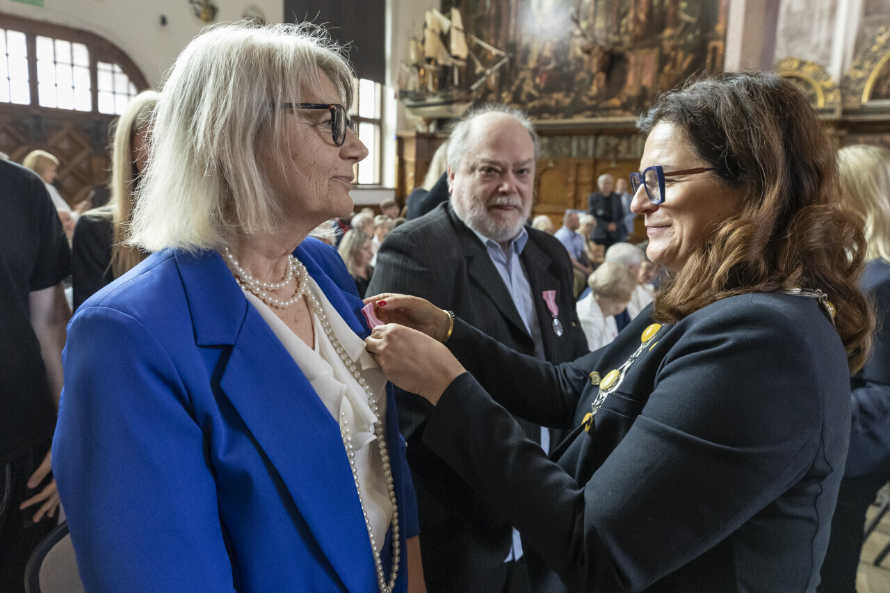 Gdańsk.Dwór Artusa. Jubileusz Par Małżeńskich - Złote Gody, podczas których Prezydent Gdańska Aleksandra Dulkiewicz wręczyła medale za długoletnie pożycie małżeńskie.