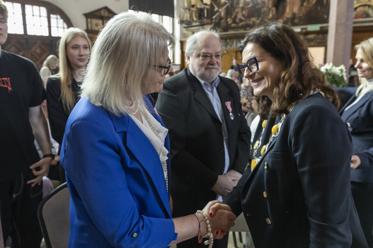 Gdańsk.Dwór Artusa. Jubileusz Par Małżeńskich - Złote Gody, podczas których Prezydent Gdańska Aleksandra Dulkiewicz wręczyła medale za długoletnie pożycie małżeńskie.