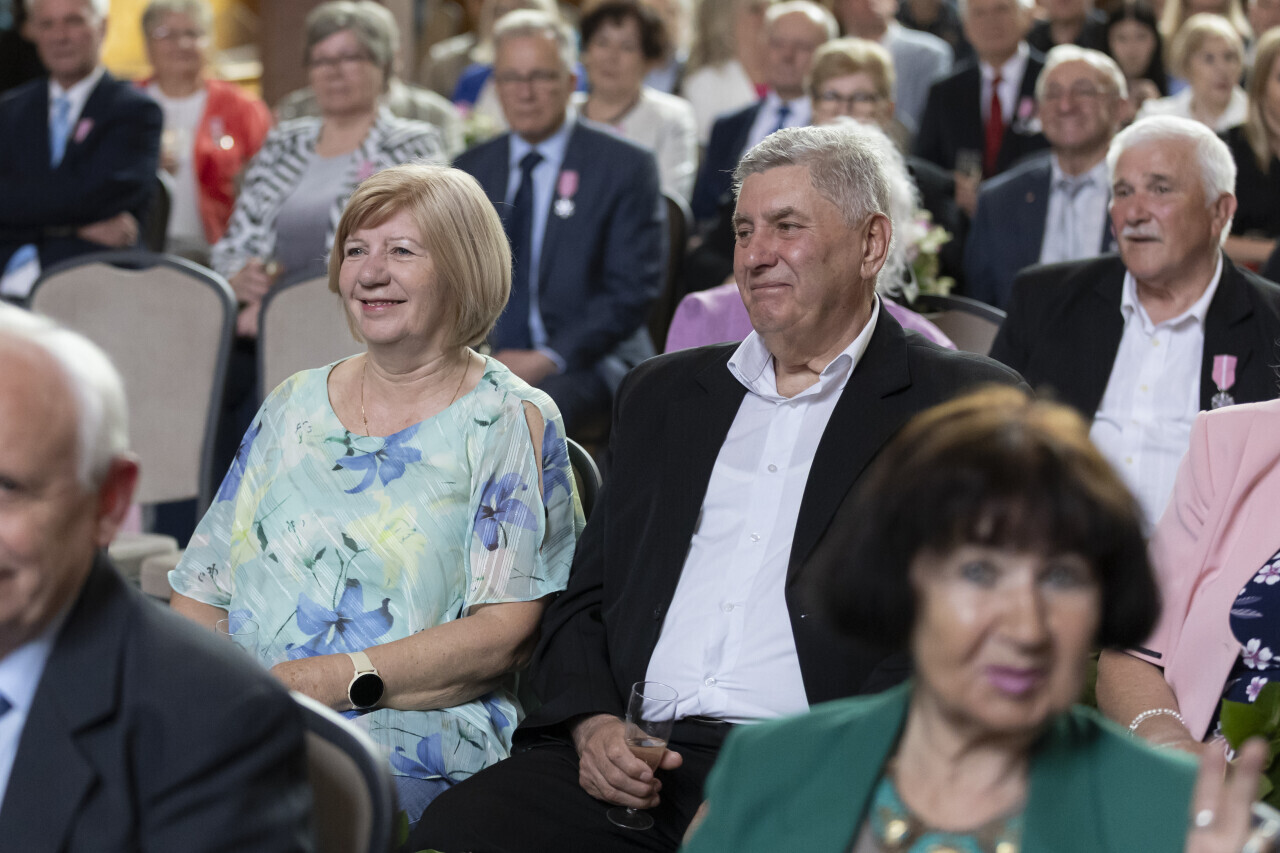 Gdańsk.Dwór Artusa. Jubileusz Par Małżeńskich - Złote Gody, podczas których Prezydent Gdańska Aleksandra Dulkiewicz wręczyła medale za długoletnie pożycie małżeńskie.