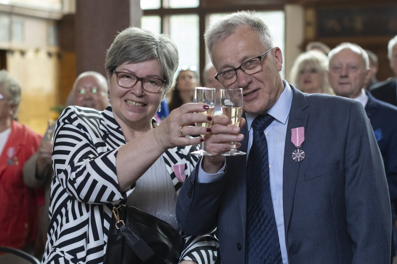 Gdańsk.Dwór Artusa. Jubileusz Par Małżeńskich - Złote Gody, podczas których Prezydent Gdańska Aleksandra Dulkiewicz wręczyła medale za długoletnie pożycie małżeńskie.