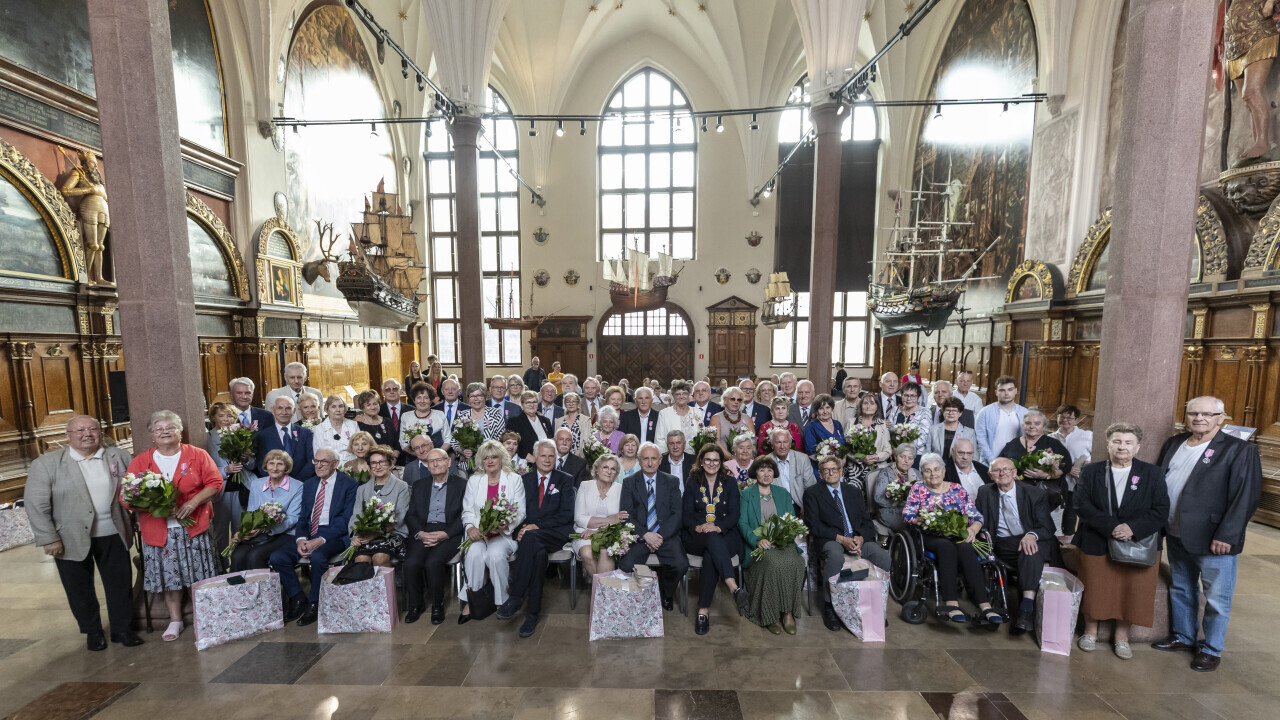 Gdańsk.Dwór Artusa. Jubileusz Par Małżeńskich - Złote Gody, podczas których Prezydent Gdańska Aleksandra Dulkiewicz wręczyła medale za długoletnie pożycie małżeńskie.