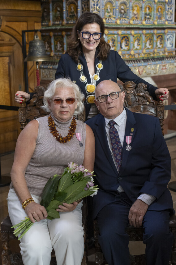 Gdańsk.Dwór Artusa. Jubileusz Par Małżeńskich - Złote Gody, podczas których Prezydent Gdańska Aleksandra Dulkiewicz wręczyła medale za długoletnie pożycie małżeńskie.