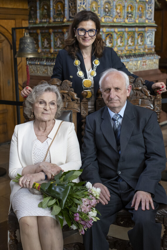 Gdańsk.Dwór Artusa. Jubileusz Par Małżeńskich - Złote Gody, podczas których Prezydent Gdańska Aleksandra Dulkiewicz wręczyła medale za długoletnie pożycie małżeńskie.