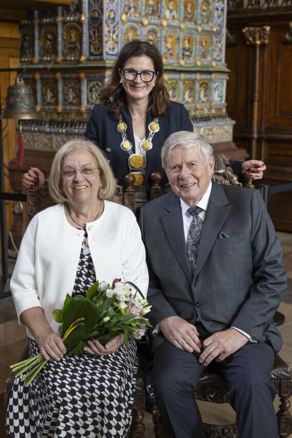 Gdańsk.Dwór Artusa. Jubileusz Par Małżeńskich - Złote Gody, podczas których Prezydent Gdańska Aleksandra Dulkiewicz wręczyła medale za długoletnie pożycie małżeńskie.