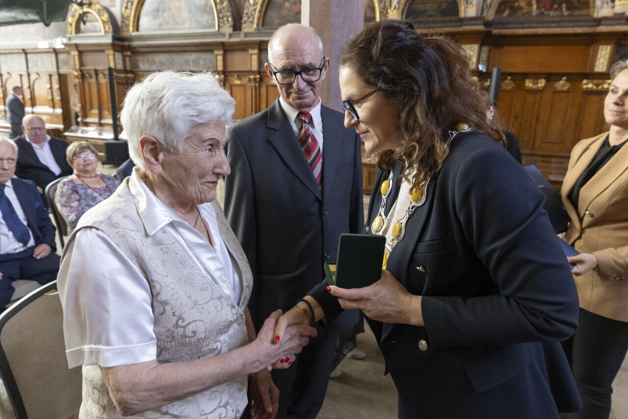 Gdańsk.Dwór Artusa. Jubileusz Par Małżeńskich - Złote Gody, podczas których Prezydent Gdańska Aleksandra Dulkiewicz wręczyła medale za długoletnie pożycie małżeńskie.