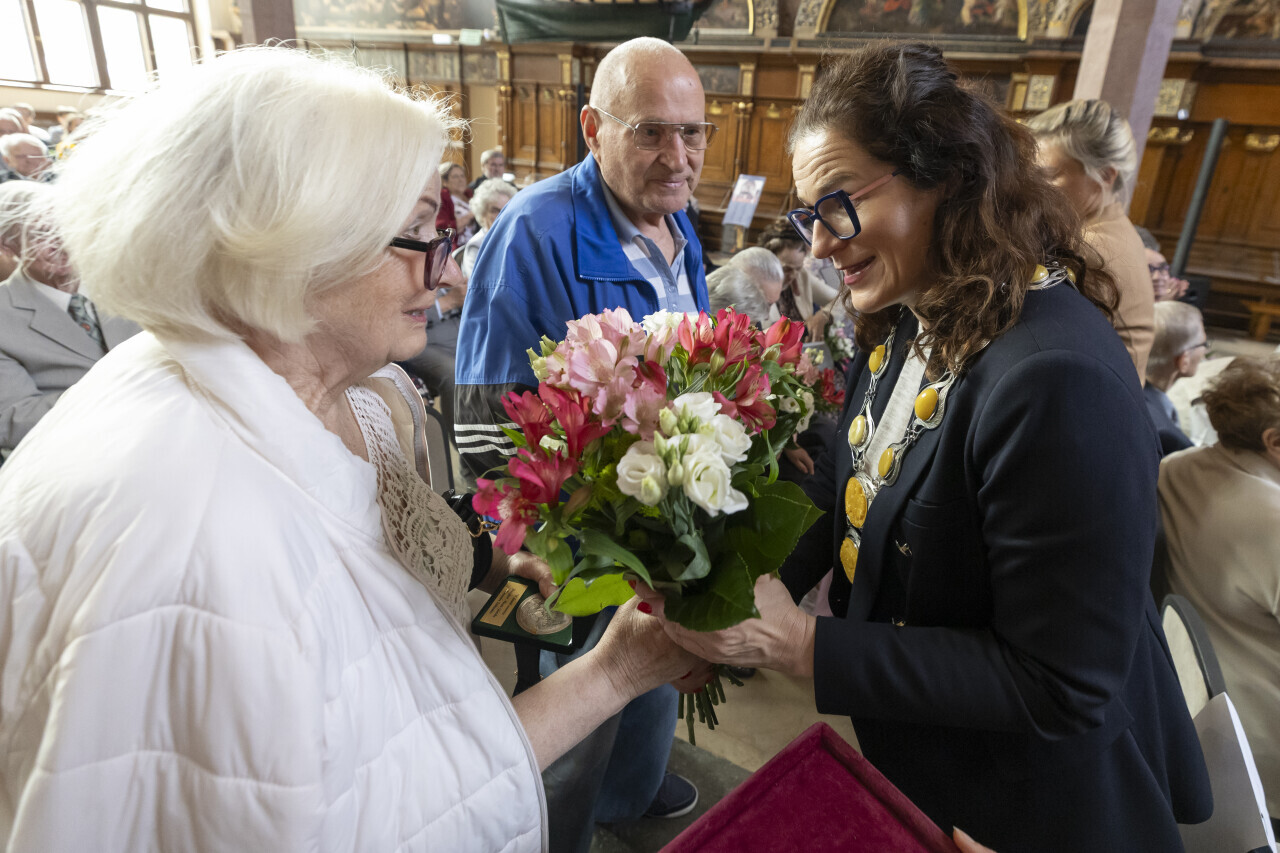 Gdańsk.Dwór Artusa. Jubileusz Par Małżeńskich - Złote Gody, podczas których Prezydent Gdańska Aleksandra Dulkiewicz wręczyła medale za długoletnie pożycie małżeńskie.