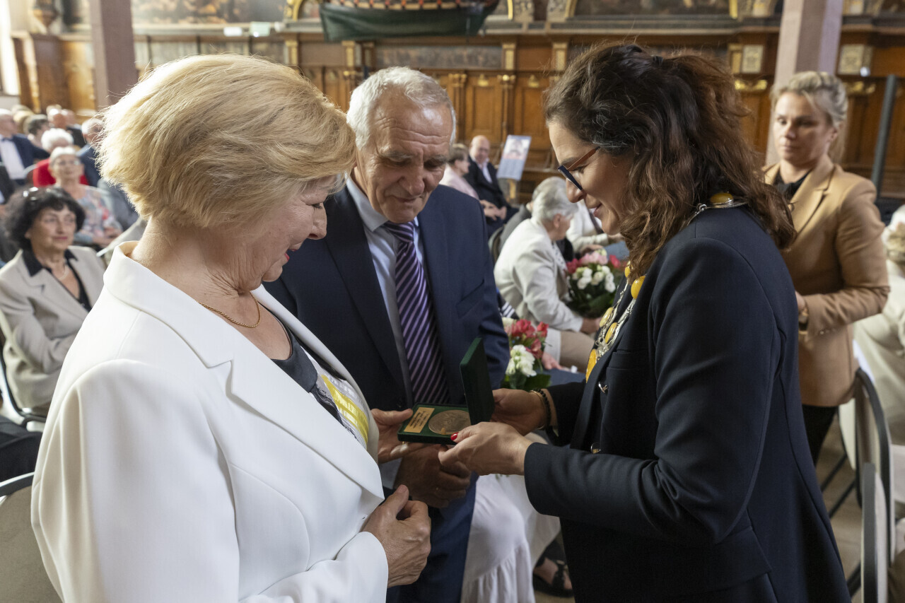 Gdańsk.Dwór Artusa. Jubileusz Par Małżeńskich - Złote Gody, podczas których Prezydent Gdańska Aleksandra Dulkiewicz wręczyła medale za długoletnie pożycie małżeńskie.