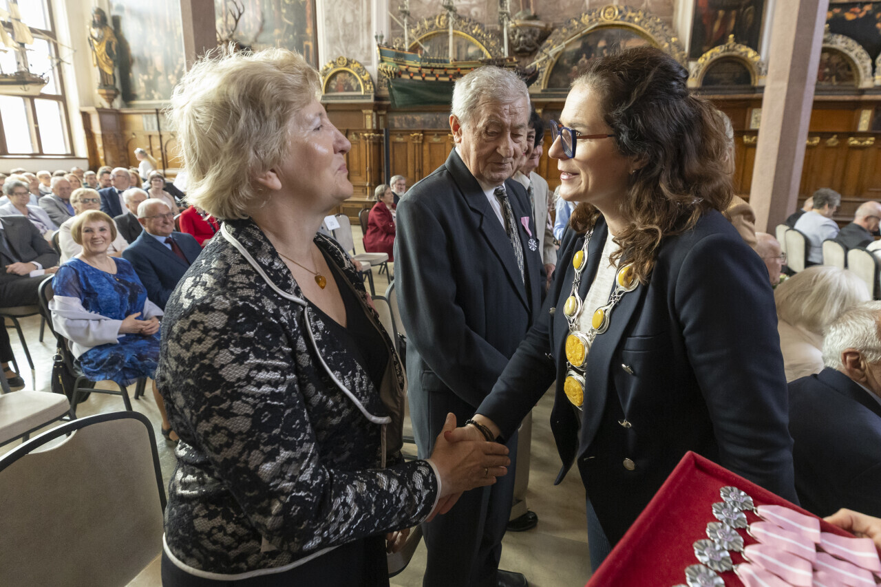 Gdańsk.Dwór Artusa. Jubileusz Par Małżeńskich - Złote Gody, podczas których Prezydent Gdańska Aleksandra Dulkiewicz wręczyła medale za długoletnie pożycie małżeńskie.