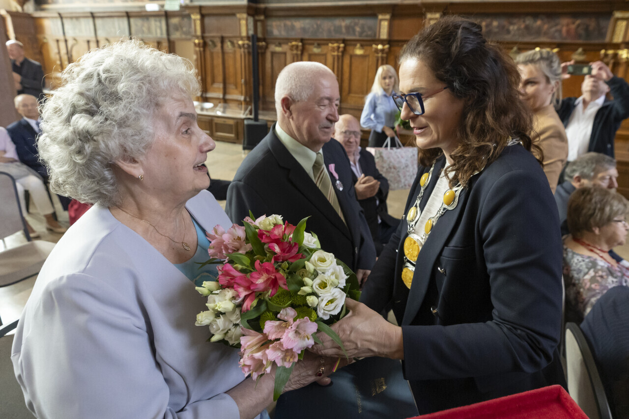 Gdańsk.Dwór Artusa. Jubileusz Par Małżeńskich - Złote Gody, podczas których Prezydent Gdańska Aleksandra Dulkiewicz wręczyła medale za długoletnie pożycie małżeńskie.