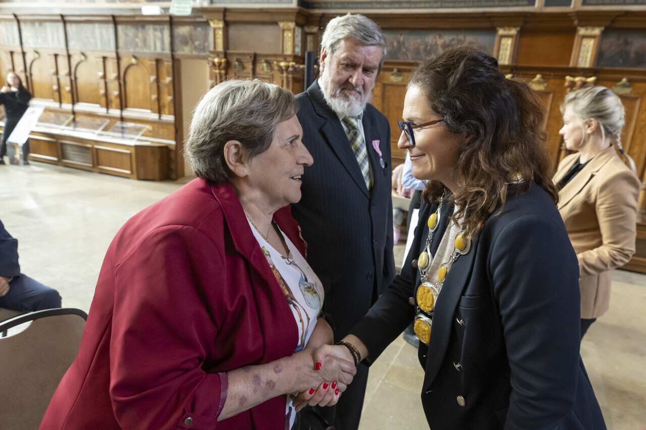Gdańsk.Dwór Artusa. Jubileusz Par Małżeńskich - Złote Gody, podczas których Prezydent Gdańska Aleksandra Dulkiewicz wręczyła medale za długoletnie pożycie małżeńskie.