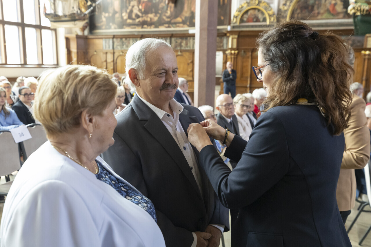 Gdańsk.Dwór Artusa. Jubileusz Par Małżeńskich - Złote Gody, podczas których Prezydent Gdańska Aleksandra Dulkiewicz wręczyła medale za długoletnie pożycie małżeńskie.