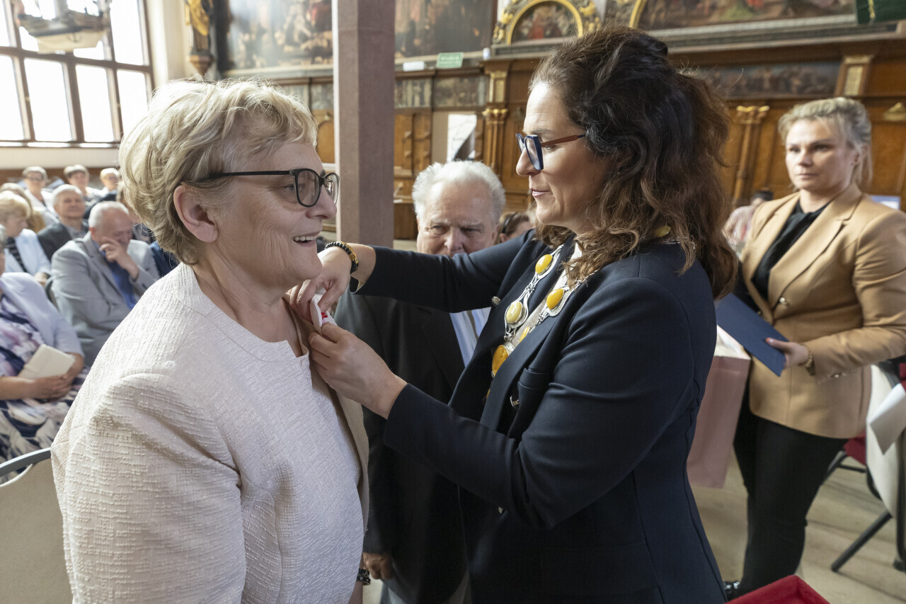 Gdańsk.Dwór Artusa. Jubileusz Par Małżeńskich - Złote Gody, podczas których Prezydent Gdańska Aleksandra Dulkiewicz wręczyła medale za długoletnie pożycie małżeńskie.