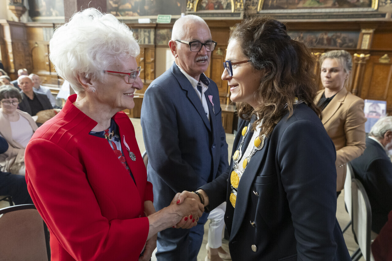 Gdańsk.Dwór Artusa. Jubileusz Par Małżeńskich - Złote Gody, podczas których Prezydent Gdańska Aleksandra Dulkiewicz wręczyła medale za długoletnie pożycie małżeńskie.