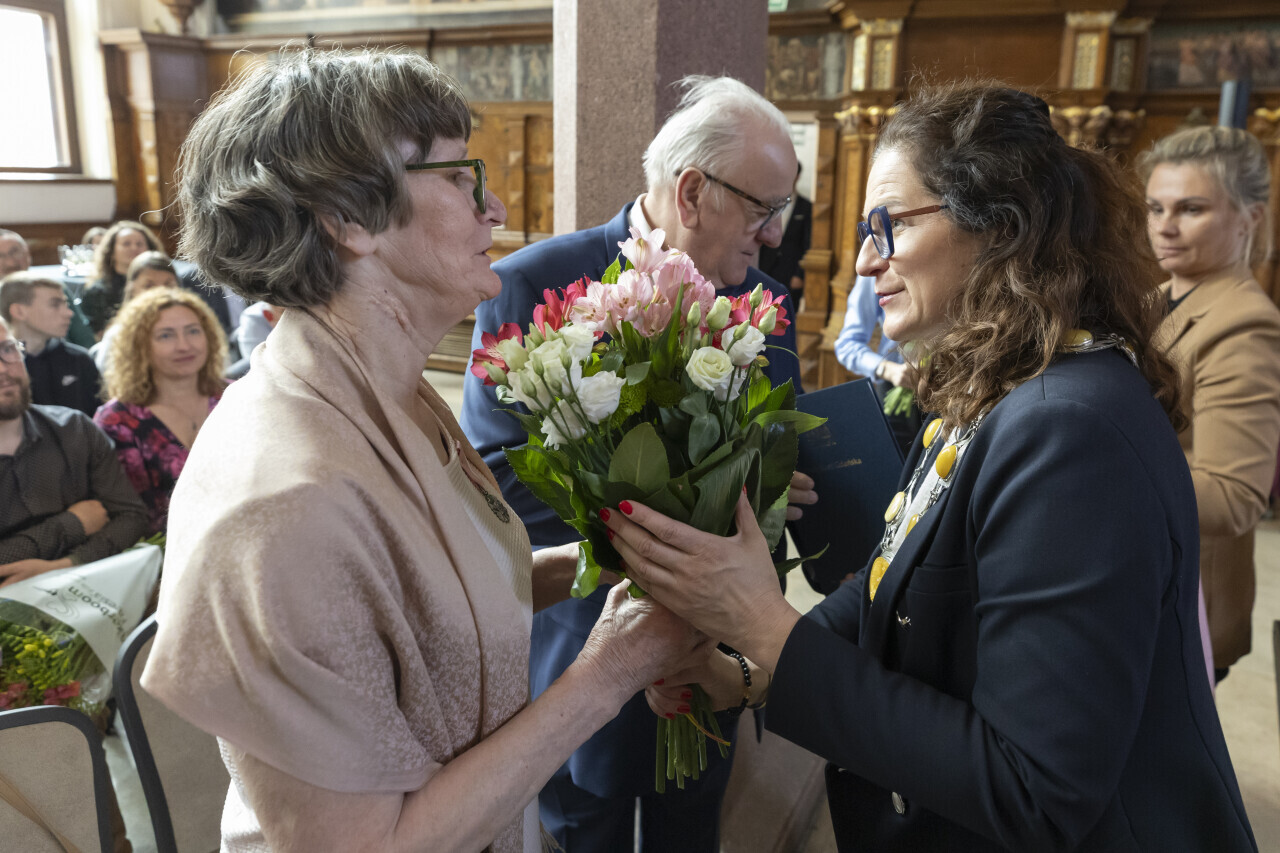 Gdańsk.Dwór Artusa. Jubileusz Par Małżeńskich - Złote Gody, podczas których Prezydent Gdańska Aleksandra Dulkiewicz wręczyła medale za długoletnie pożycie małżeńskie.