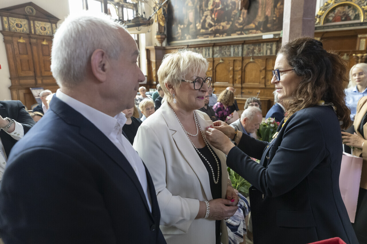Gdańsk.Dwór Artusa. Jubileusz Par Małżeńskich - Złote Gody, podczas których Prezydent Gdańska Aleksandra Dulkiewicz wręczyła medale za długoletnie pożycie małżeńskie.