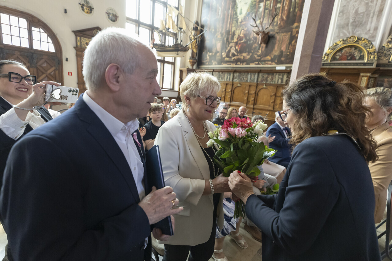 Gdańsk.Dwór Artusa. Jubileusz Par Małżeńskich - Złote Gody, podczas których Prezydent Gdańska Aleksandra Dulkiewicz wręczyła medale za długoletnie pożycie małżeńskie.