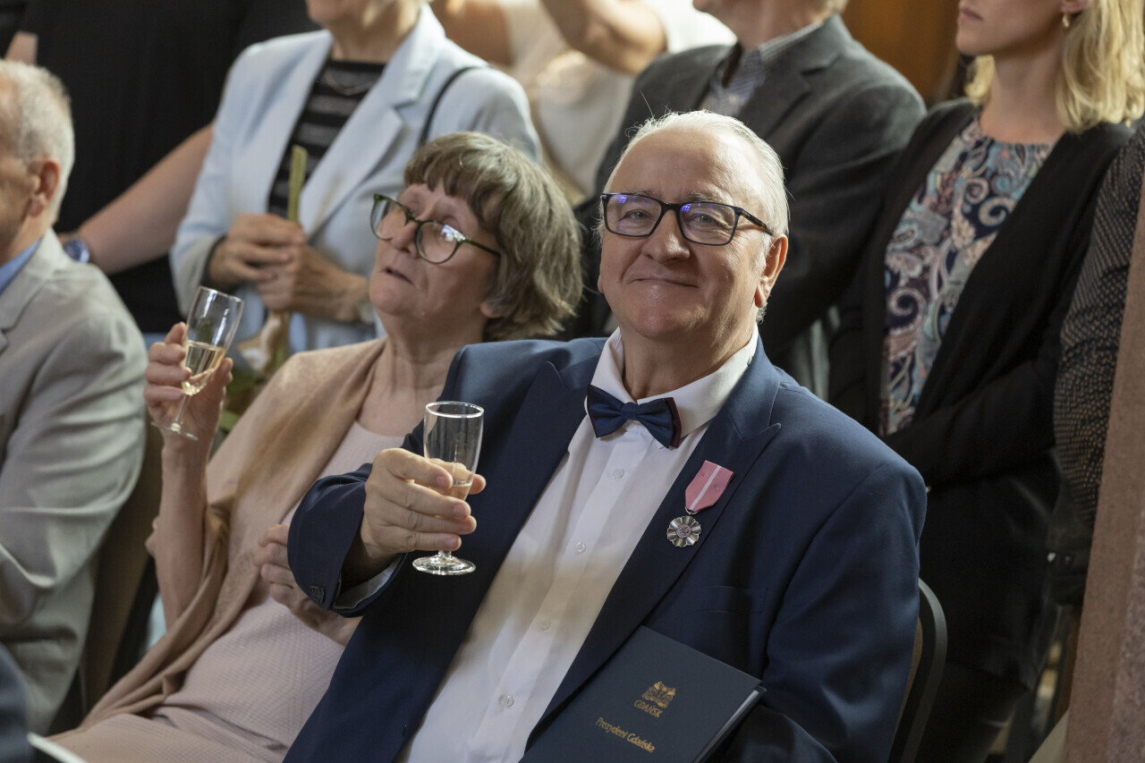 Gdańsk.Dwór Artusa. Jubileusz Par Małżeńskich - Złote Gody, podczas których Prezydent Gdańska Aleksandra Dulkiewicz wręczyła medale za długoletnie pożycie małżeńskie.