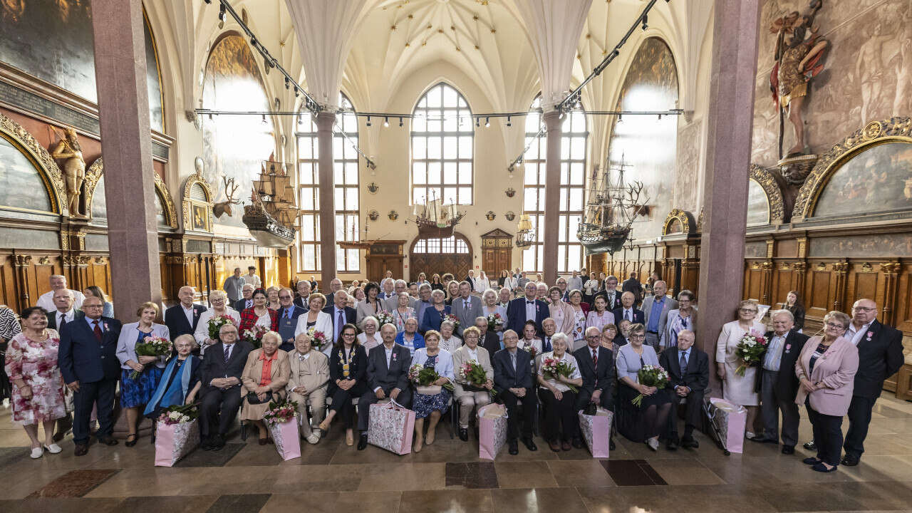 Gdańsk.Dwór Artusa. Jubileusz Par Małżeńskich - Złote Gody, podczas których Prezydent Gdańska Aleksandra Dulkiewicz wręczyła medale za długoletnie pożycie małżeńskie.