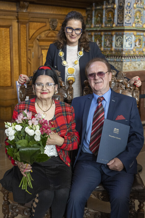 Gdańsk.Dwór Artusa. Jubileusz Par Małżeńskich - Złote Gody, podczas których Prezydent Gdańska Aleksandra Dulkiewicz wręczyła medale za długoletnie pożycie małżeńskie.