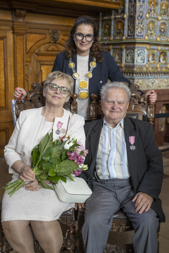 Gdańsk.Dwór Artusa. Jubileusz Par Małżeńskich - Złote Gody, podczas których Prezydent Gdańska Aleksandra Dulkiewicz wręczyła medale za długoletnie pożycie małżeńskie.