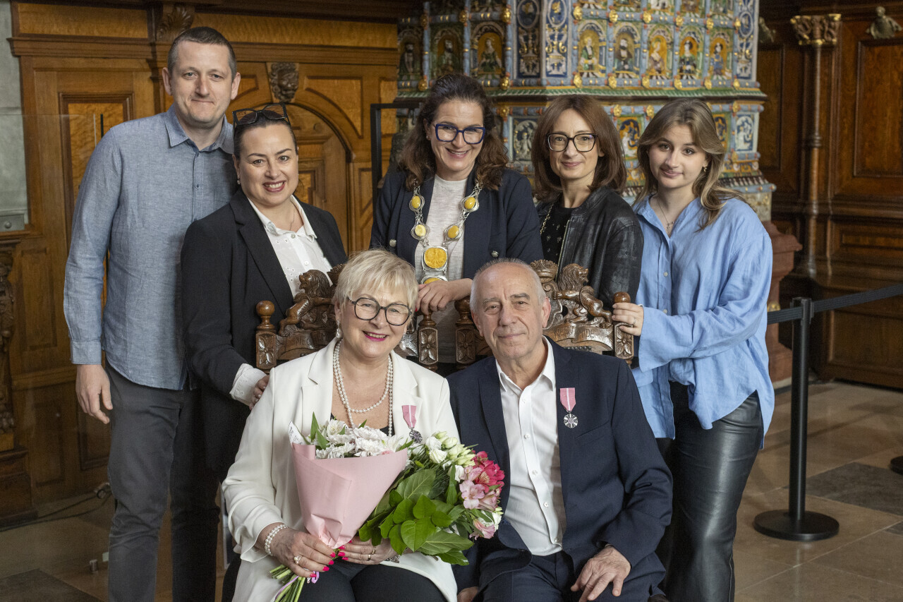 Gdańsk.Dwór Artusa. Jubileusz Par Małżeńskich - Złote Gody, podczas których Prezydent Gdańska Aleksandra Dulkiewicz wręczyła medale za długoletnie pożycie małżeńskie.