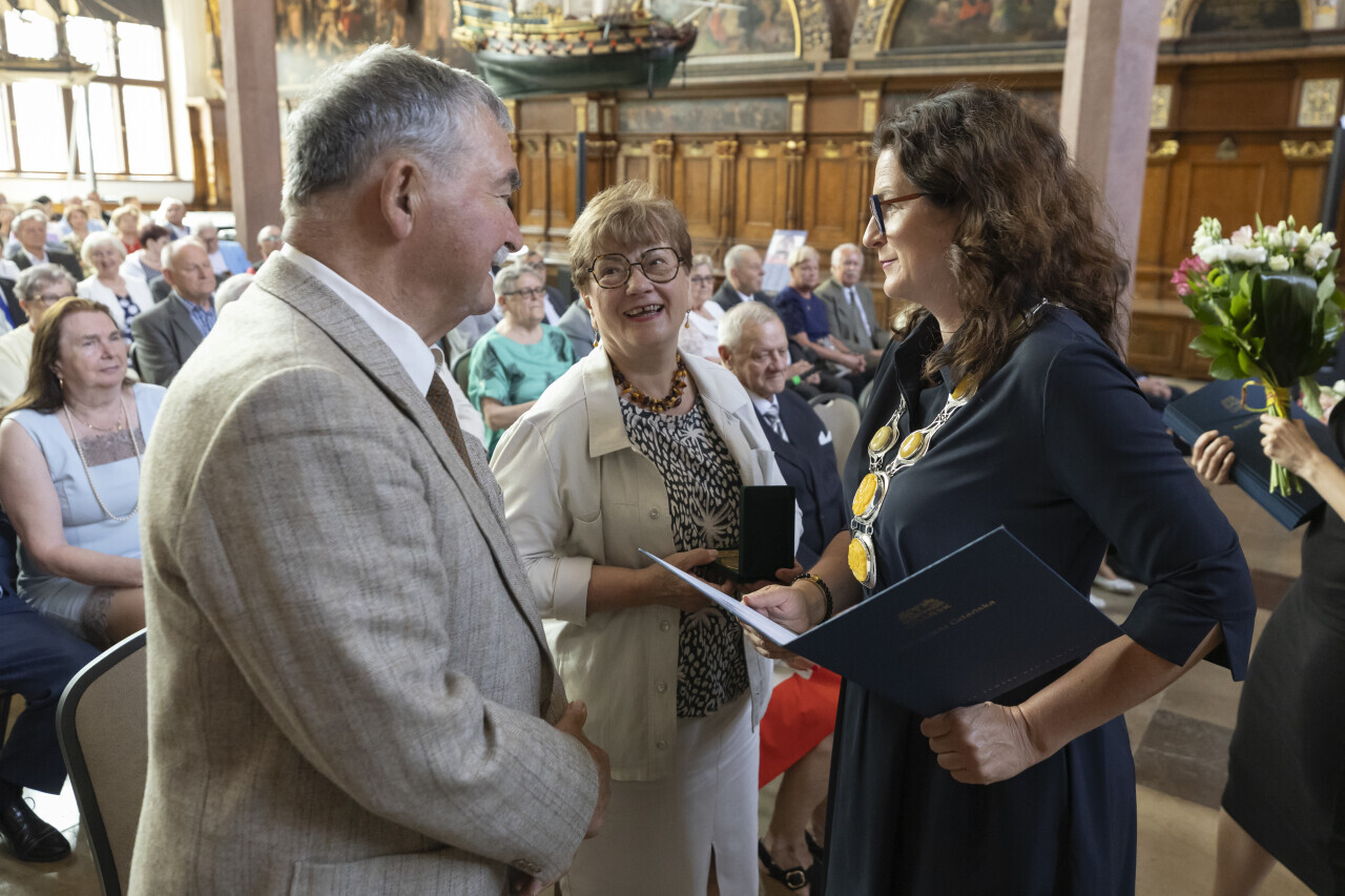 Gdańsk. Dwór Artusa. Jubileusz Par Małżeńskich - Złote Gody, podczas których Prezydent Gdańska Aleksandra Dulkiewicz wręczyła medale za długoletnie pożycie małżeńskie.