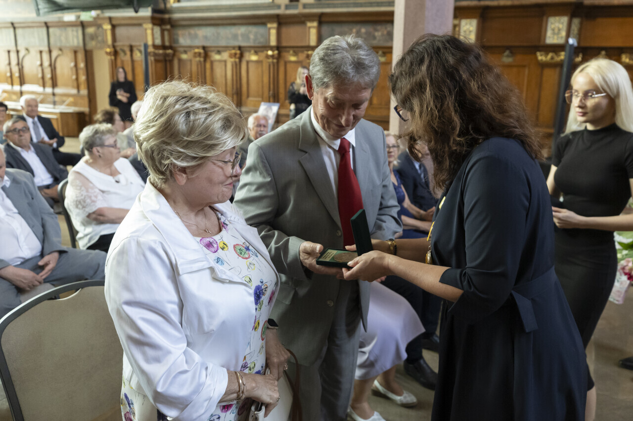 Gdańsk. Dwór Artusa. Jubileusz Par Małżeńskich - Złote Gody, podczas których Prezydent Gdańska Aleksandra Dulkiewicz wręczyła medale za długoletnie pożycie małżeńskie.