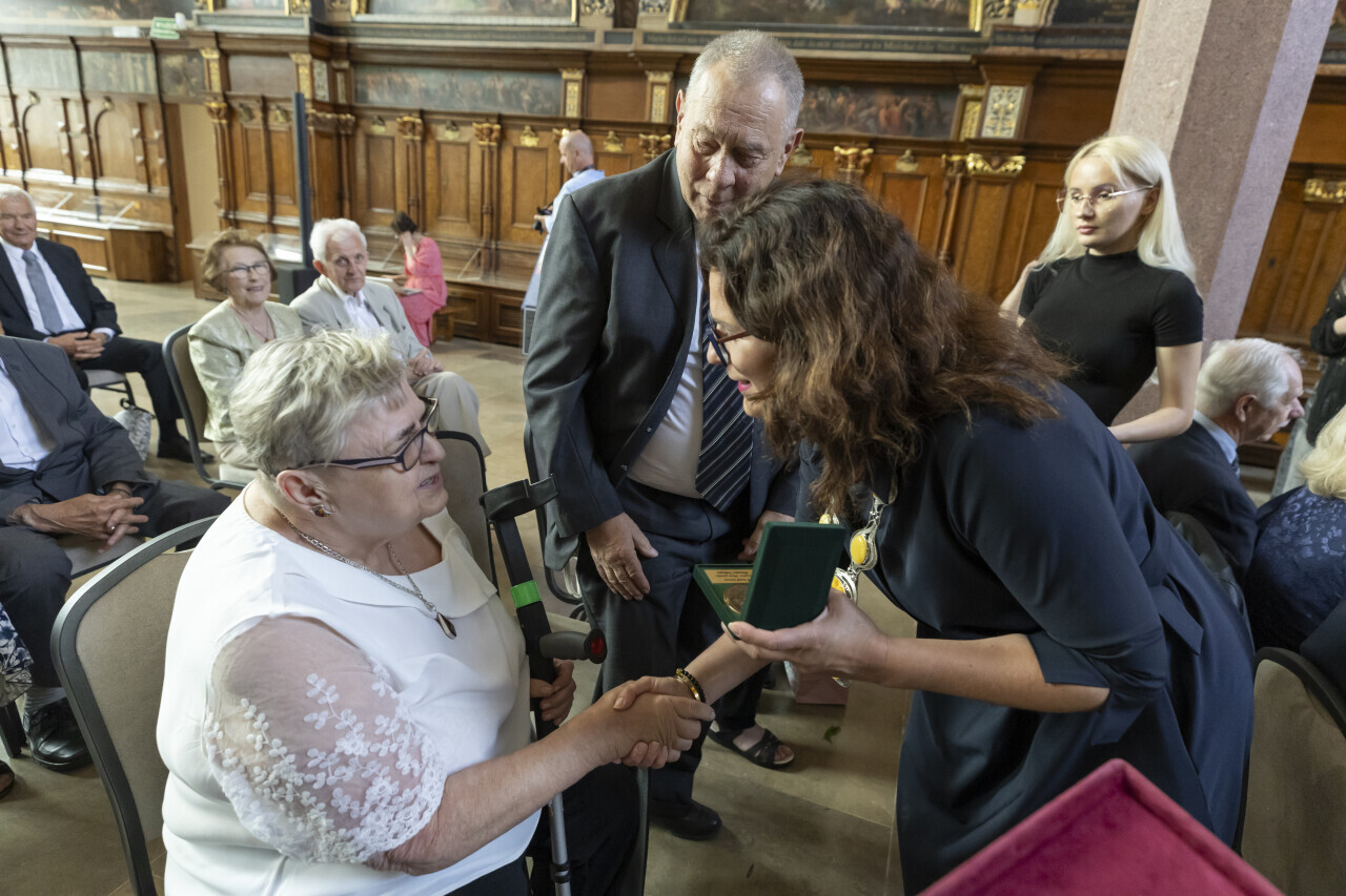 Gdańsk. Dwór Artusa. Jubileusz Par Małżeńskich - Złote Gody, podczas których Prezydent Gdańska Aleksandra Dulkiewicz wręczyła medale za długoletnie pożycie małżeńskie.