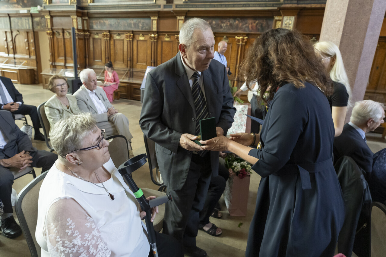 Gdańsk. Dwór Artusa. Jubileusz Par Małżeńskich - Złote Gody, podczas których Prezydent Gdańska Aleksandra Dulkiewicz wręczyła medale za długoletnie pożycie małżeńskie.