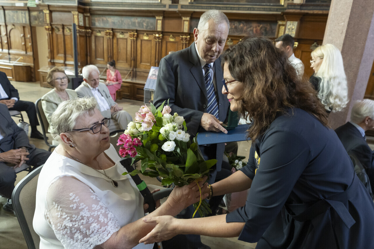 Gdańsk. Dwór Artusa. Jubileusz Par Małżeńskich - Złote Gody, podczas których Prezydent Gdańska Aleksandra Dulkiewicz wręczyła medale za długoletnie pożycie małżeńskie.