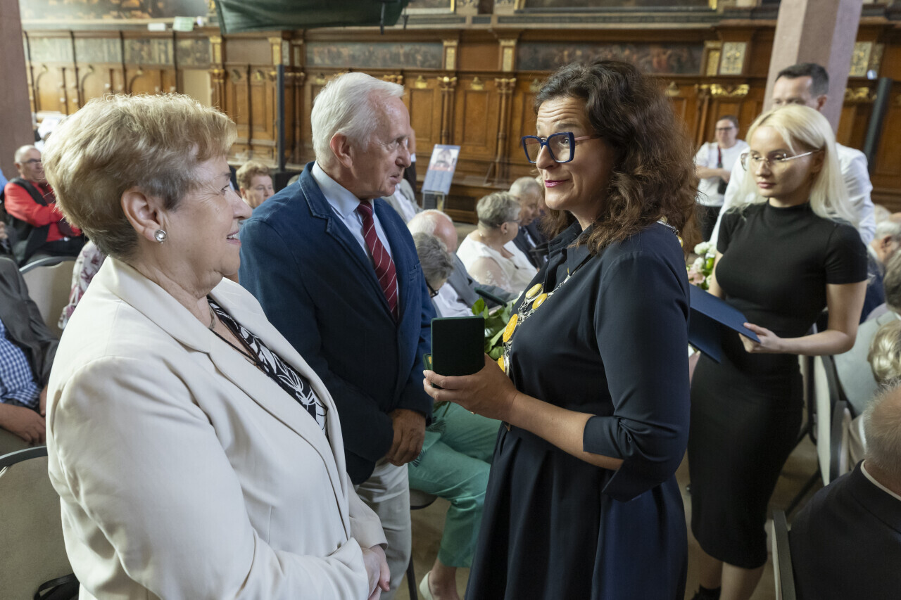 Gdańsk. Dwór Artusa. Jubileusz Par Małżeńskich - Złote Gody, podczas których Prezydent Gdańska Aleksandra Dulkiewicz wręczyła medale za długoletnie pożycie małżeńskie.