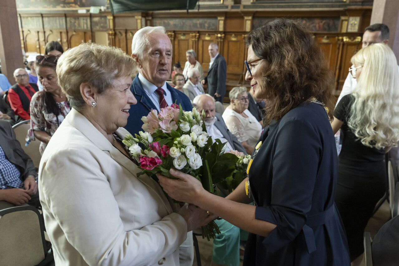 Gdańsk. Dwór Artusa. Jubileusz Par Małżeńskich - Złote Gody, podczas których Prezydent Gdańska Aleksandra Dulkiewicz wręczyła medale za długoletnie pożycie małżeńskie.