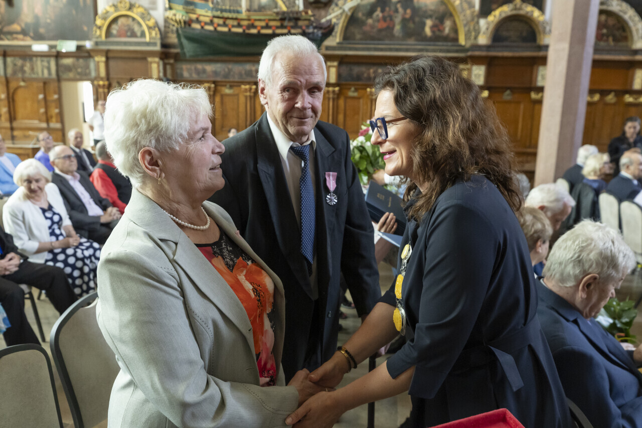 Gdańsk. Dwór Artusa. Jubileusz Par Małżeńskich - Złote Gody, podczas których Prezydent Gdańska Aleksandra Dulkiewicz wręczyła medale za długoletnie pożycie małżeńskie.