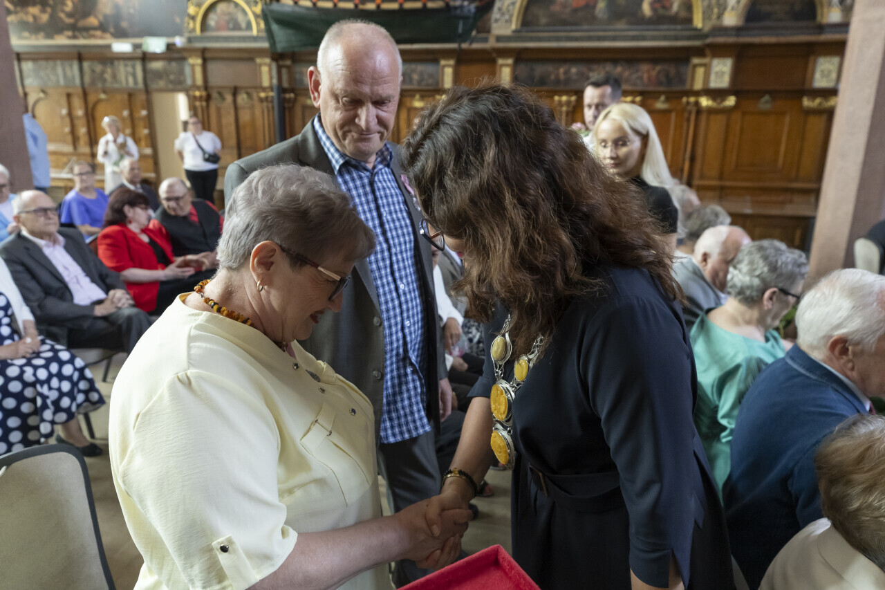 Gdańsk. Dwór Artusa. Jubileusz Par Małżeńskich - Złote Gody, podczas których Prezydent Gdańska Aleksandra Dulkiewicz wręczyła medale za długoletnie pożycie małżeńskie.