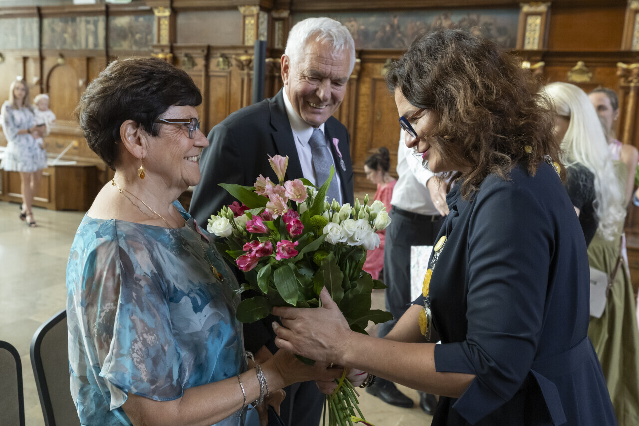 Gdańsk. Dwór Artusa. Jubileusz Par Małżeńskich - Złote Gody, podczas których Prezydent Gdańska Aleksandra Dulkiewicz wręczyła medale za długoletnie pożycie małżeńskie.