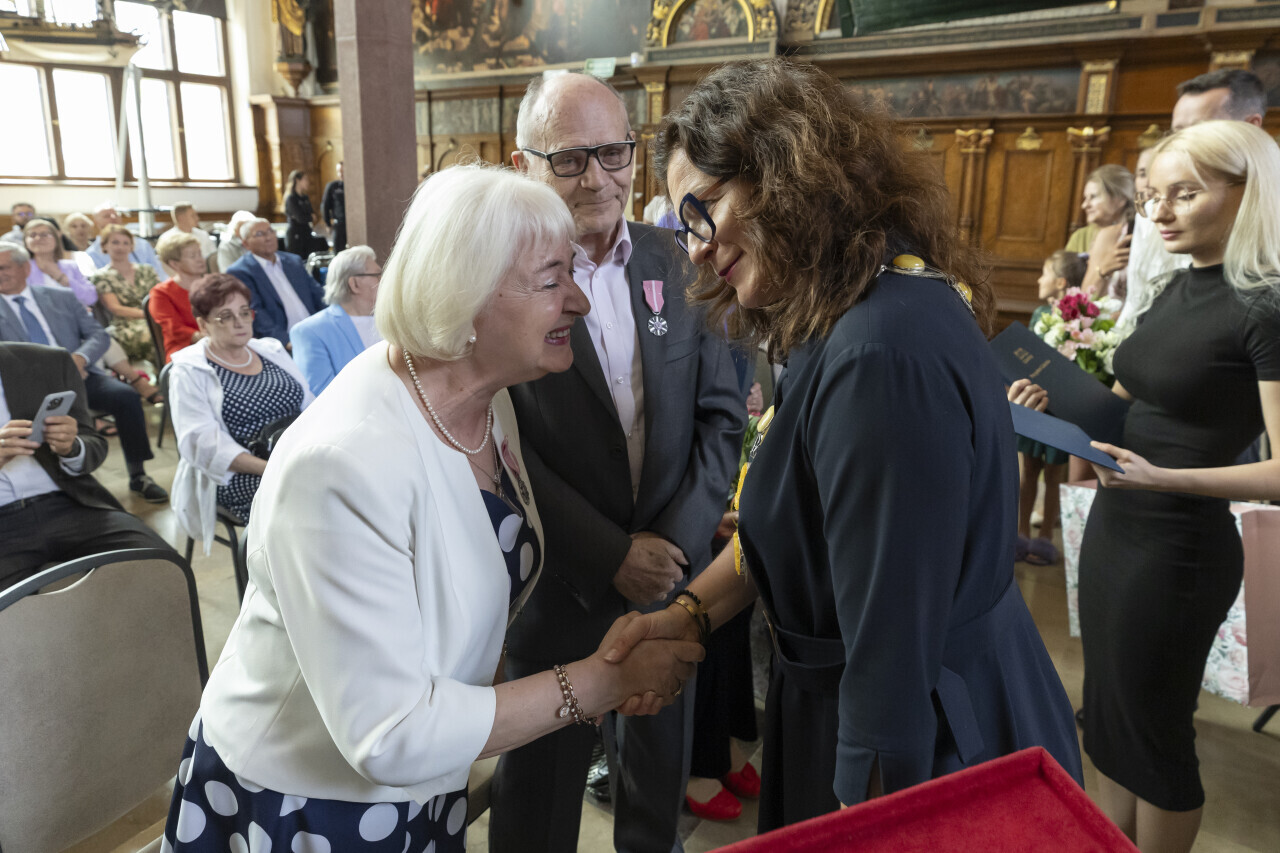 Gdańsk. Dwór Artusa. Jubileusz Par Małżeńskich - Złote Gody, podczas których Prezydent Gdańska Aleksandra Dulkiewicz wręczyła medale za długoletnie pożycie małżeńskie.
