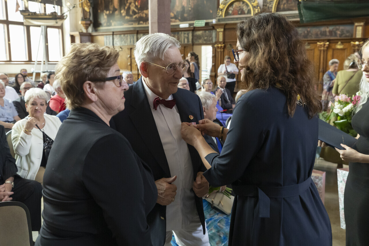 Gdańsk. Dwór Artusa. Jubileusz Par Małżeńskich - Złote Gody, podczas których Prezydent Gdańska Aleksandra Dulkiewicz wręczyła medale za długoletnie pożycie małżeńskie.