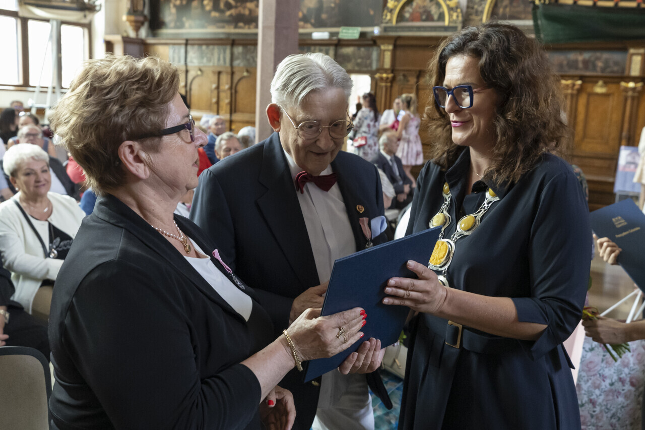 Gdańsk. Dwór Artusa. Jubileusz Par Małżeńskich - Złote Gody, podczas których Prezydent Gdańska Aleksandra Dulkiewicz wręczyła medale za długoletnie pożycie małżeńskie.