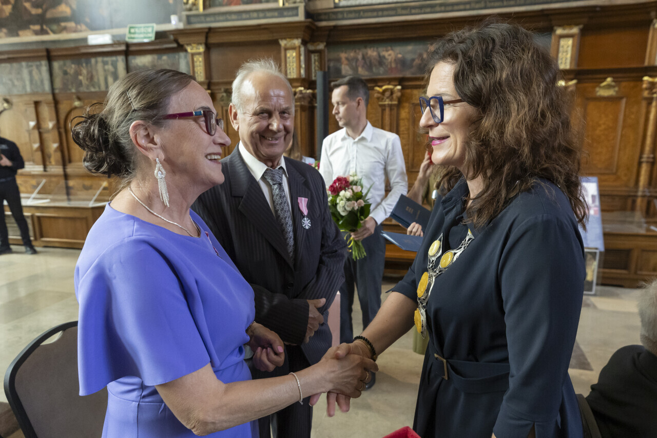 Gdańsk. Dwór Artusa. Jubileusz Par Małżeńskich - Złote Gody, podczas których Prezydent Gdańska Aleksandra Dulkiewicz wręczyła medale za długoletnie pożycie małżeńskie.