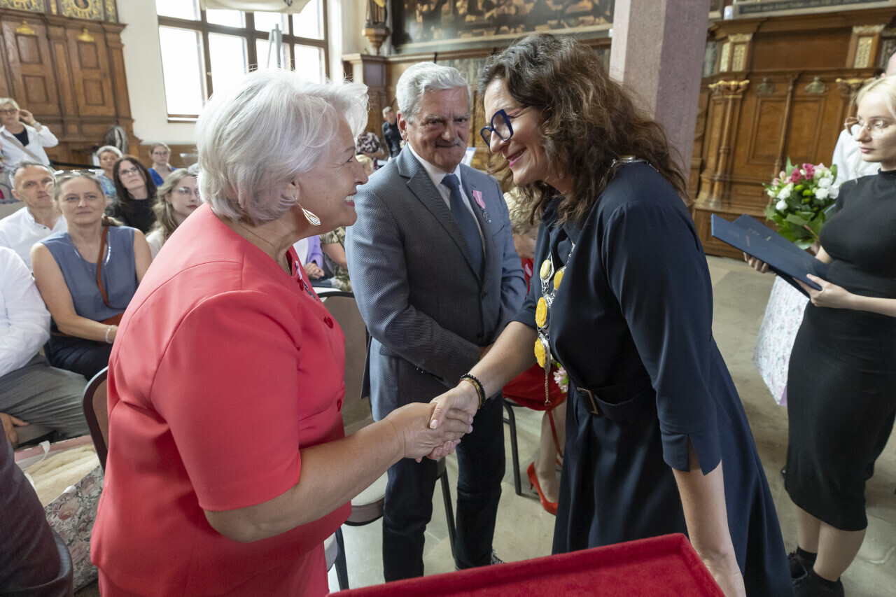 Gdańsk. Dwór Artusa. Jubileusz Par Małżeńskich - Złote Gody, podczas których Prezydent Gdańska Aleksandra Dulkiewicz wręczyła medale za długoletnie pożycie małżeńskie.