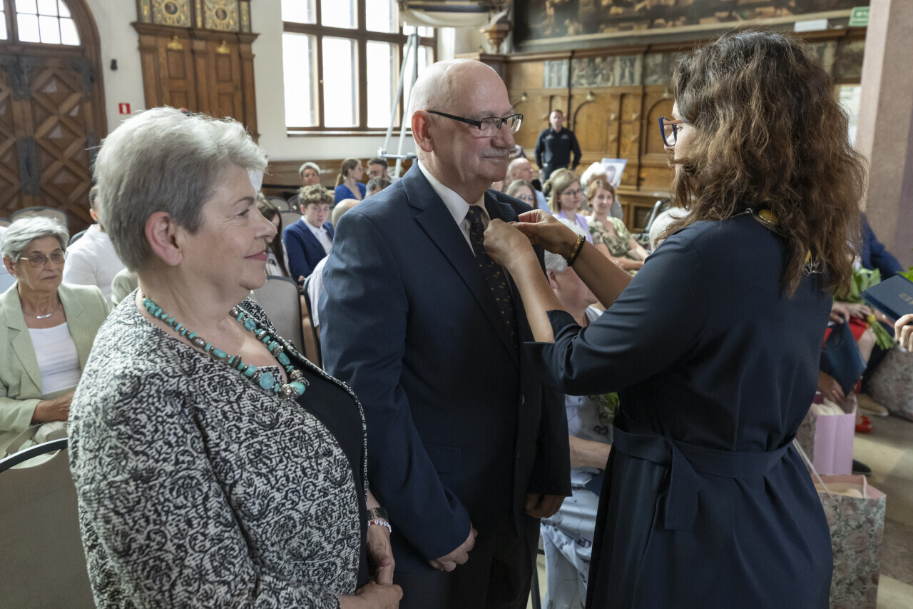Gdańsk. Dwór Artusa. Jubileusz Par Małżeńskich - Złote Gody, podczas których Prezydent Gdańska Aleksandra Dulkiewicz wręczyła medale za długoletnie pożycie małżeńskie.